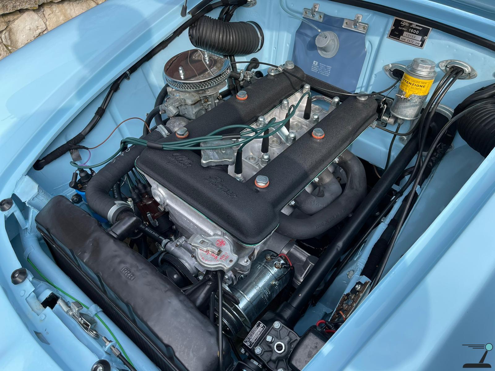 For the restoration the body was blasted to bare metal. The restoration of the body took around 600 hours of work. After the work was done, the Car was painted in the alfa romeo colour AR 513 Blu Celeste which was available till 1967.
