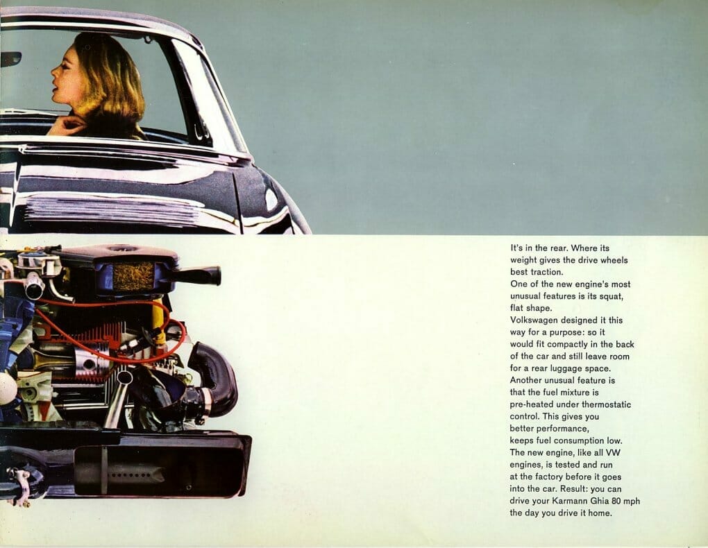 An electrically operated sliding steel sunroof was optional in 1962, the second automobile model in the world to have this option. The styling offered more interior and cargo room than the original Karmann Ghia. It featured an electric clock, three luggage spaces, built-in fog lights, round tail lights, upper and lower dash pads, door pads, and long padded armrests. It was the fastest production VW model of its day.