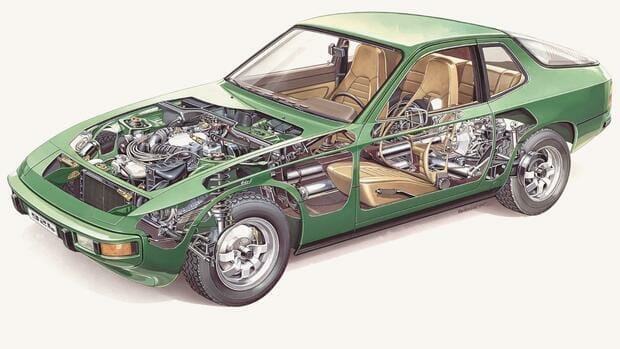 Although the water-cooled, front-engined 928 gran turismo was designed first, the 924 was the first road-going Porsche to have a front engine rear wheel drive configuration.