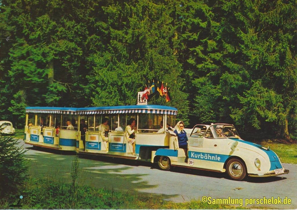 The idea of making it easier for holidaymakers in Freudenstadt to get to Parkwald was born in 1957. Even then, there were barriers to overcome with the administration, and so in the spring of 1960, official permission was granted and in the summer of 1961, operations could finally begin. The founding partners at the time were Mia Broermann, Siegfried Klaus, Ernst Luz, Fritz Klumpp and Karl-Heinz Katz. The first train had a Zugmaschiene and two trailers, was about 25 metres long and had room for about 40 guests. The driver of the Waldbahn, Josef Hafner and his wife Rose, were a stroke of luck for the Freudenstadt Bähnle. For more than 30 years he was the “Waldbahn Hafner” and was part of the townscape with the Waldbahn. Until 1991, he drove about 60,000 round trips from the market square to the park forest, and during the trip, he brought all the sights of the town, the beauties and possibilities of the Freudenstadt park forest closer to the guests. A jewel slumbered under the Kässbohrer attachment of the tractor: a 60 hp Porsche 356 engine revered by connoisseurs as the “Lady”.