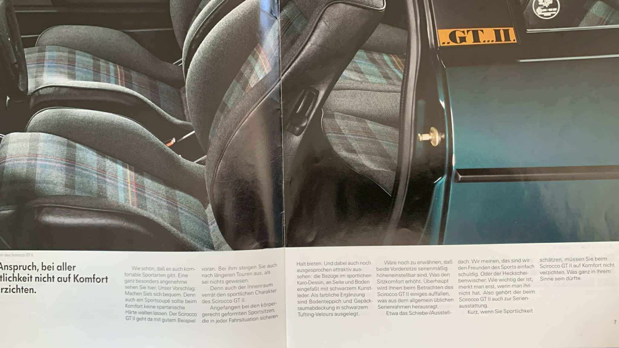 The Scirocco was delivered in the Colour: green pearl effect R 6 with the interior: a four-colour chequered fashion check, like in the original brochure that comes with the Car.