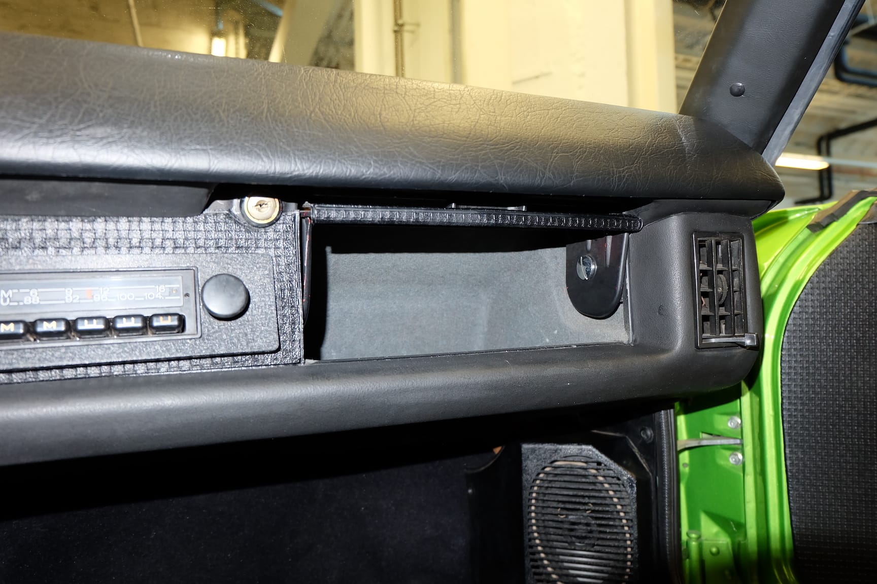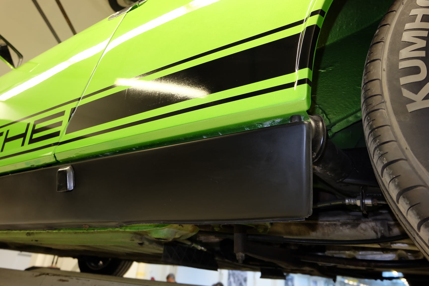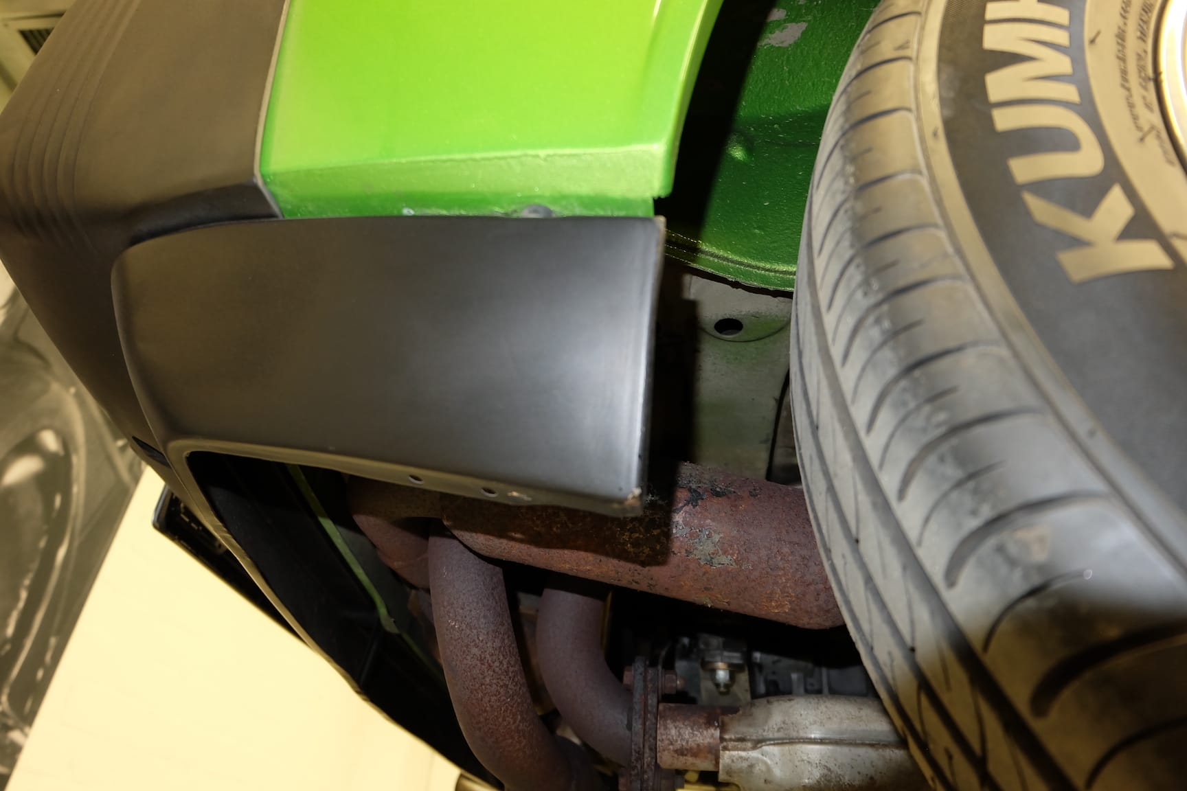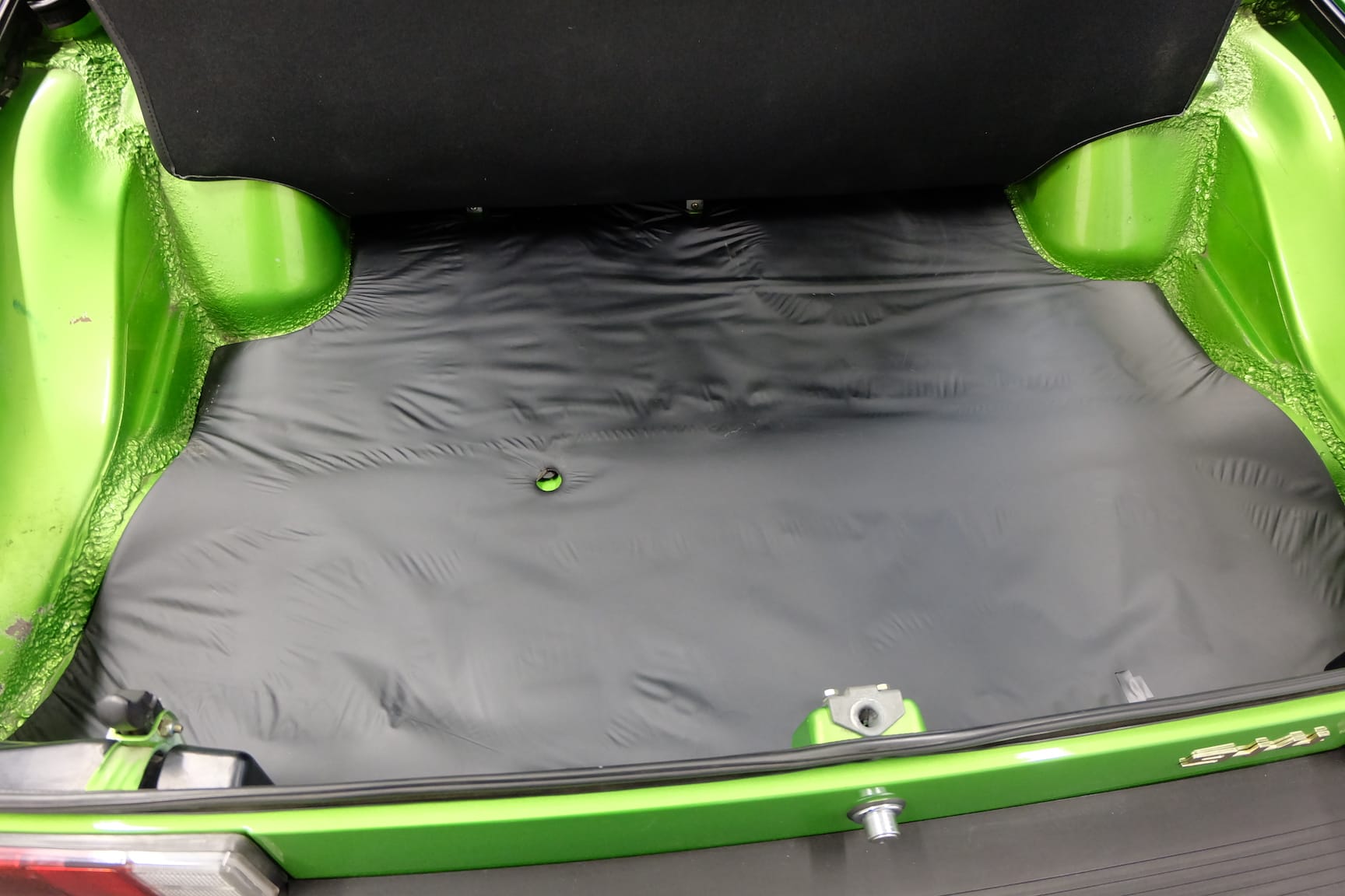 The Car was stripped down and on the outside of the Car, the colour was removed. He kept the original paint on the inside of the Car like the Trunk,l engine Compartment and the storage room for the roof. As the colour was removed the wholes for the side markers of the American version were closed as well to give the side a sleeker look.