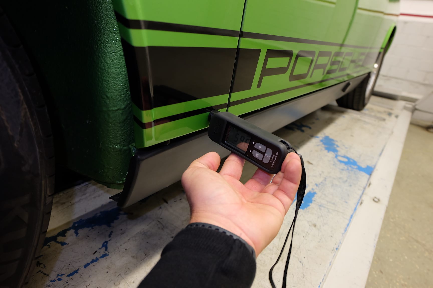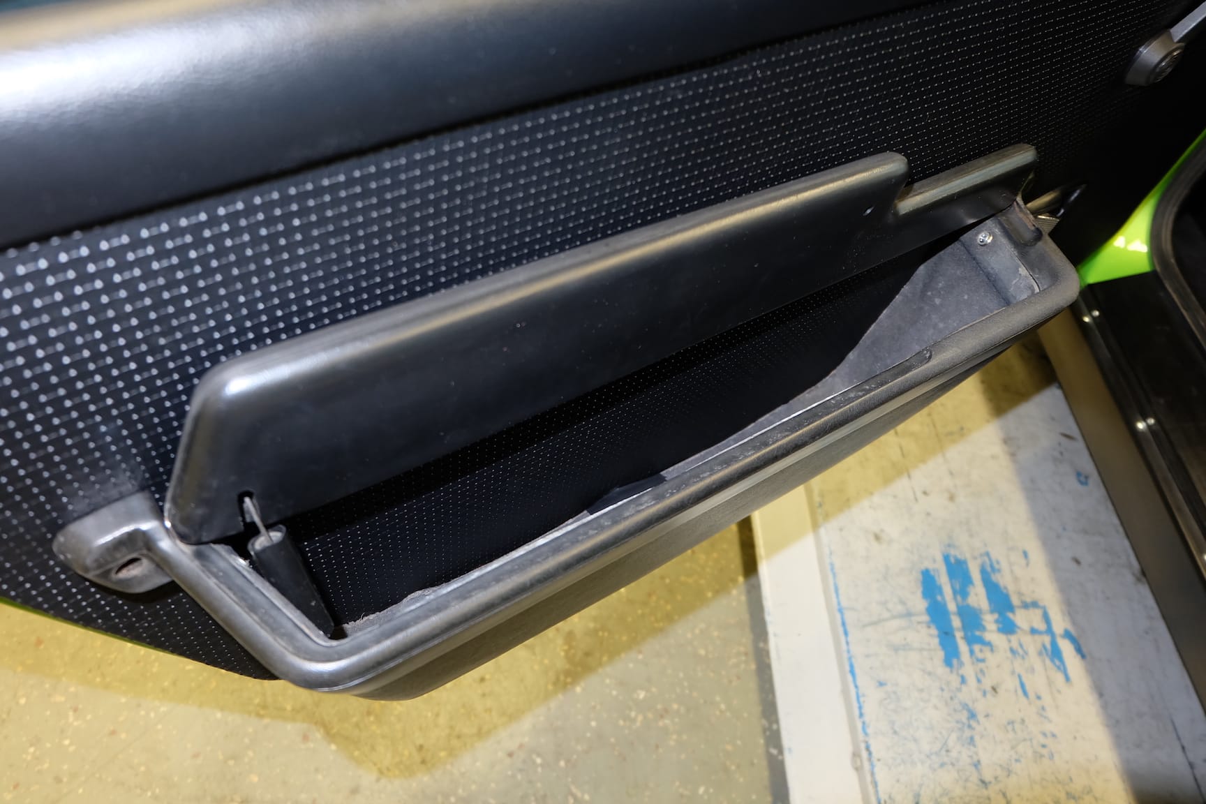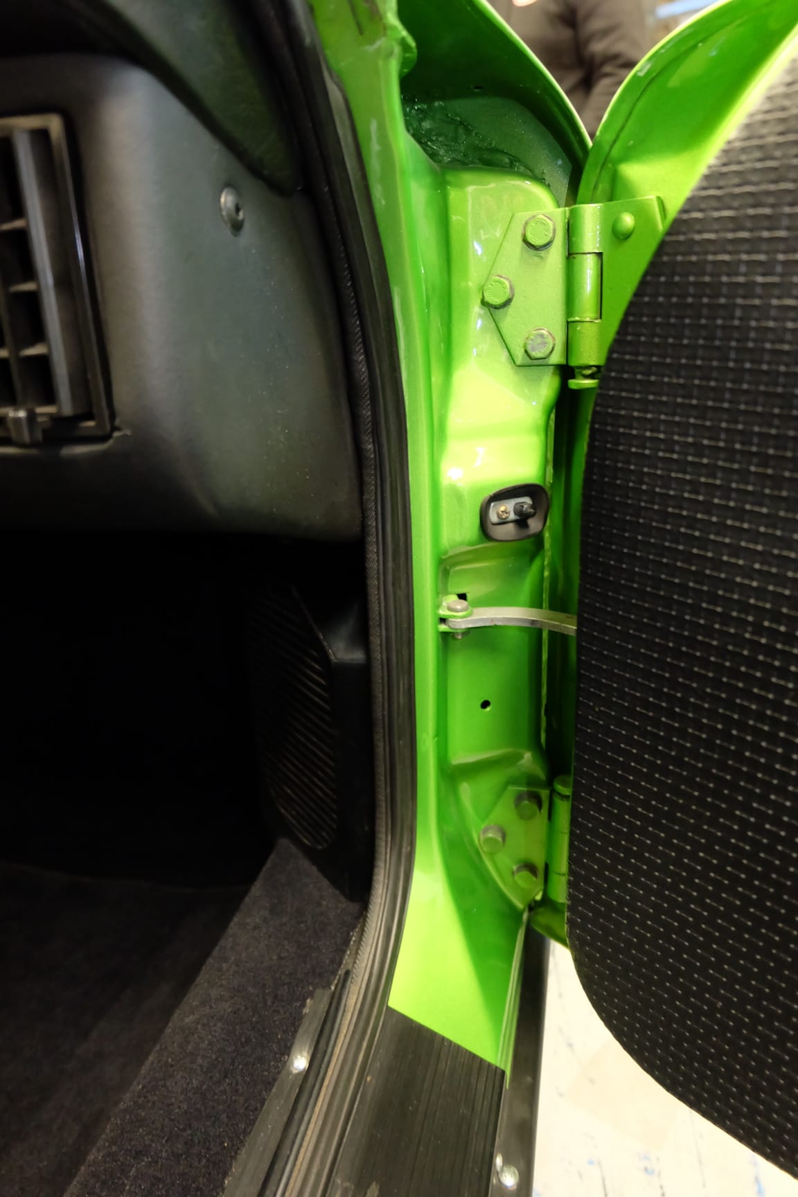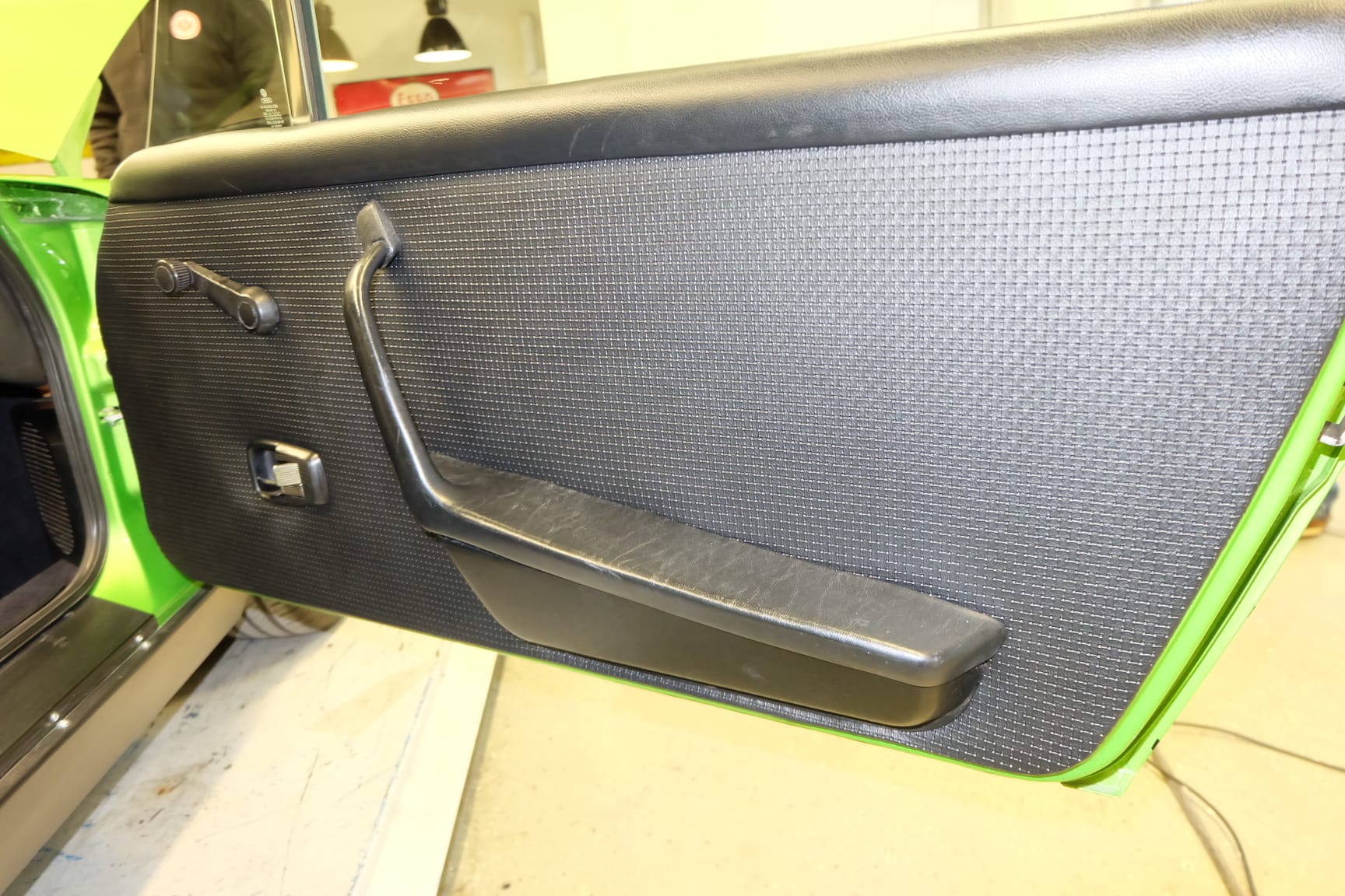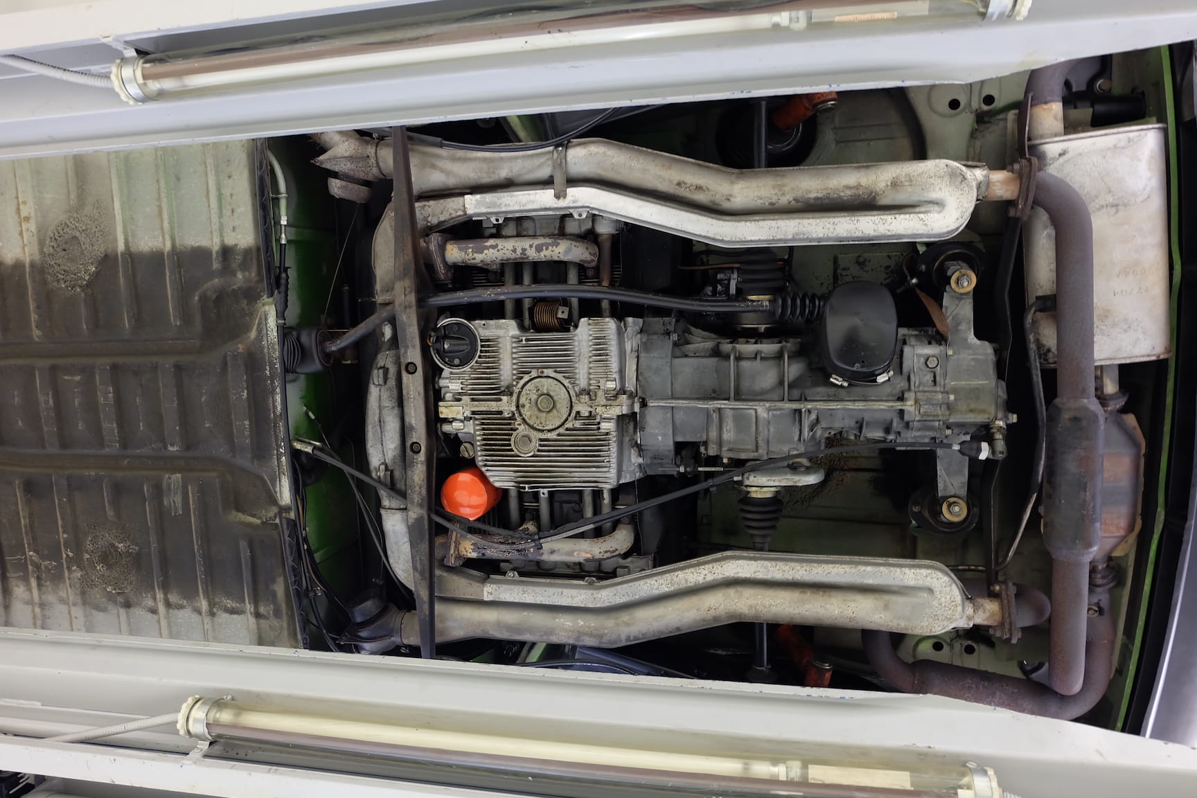 The Car was stripped down and on the outside of the Car, the colour was removed. He kept the original paint on the inside of the Car like the Trunk,l engine Compartment and the storage room for the roof. As the colour was removed the wholes for the side markers of the American version were closed as well to give the side a sleeker look.